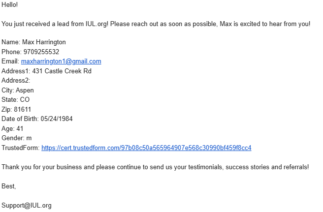 IUL Leads are delivered in real-time to your CRM and email with complete contact details, verified TrustedForm certificate, and a screen recording of the opt-in. Here's the exact format you'll receive: